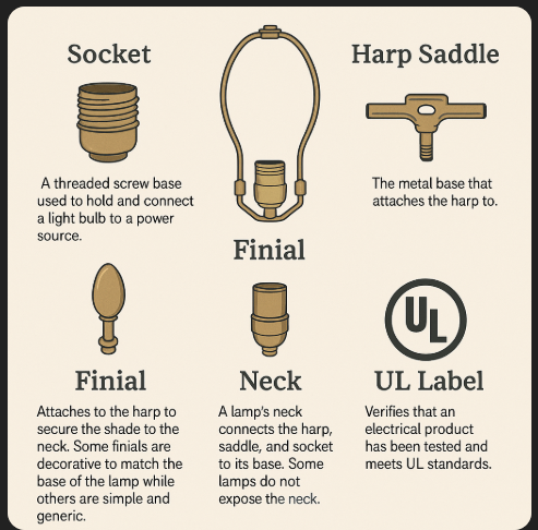 Harp: The wire support that attaches to the socket and supports the shade at the top.